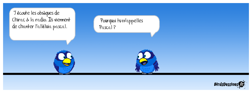 Case 1:Bird 1: J écoute les obsèques de Chirac à la radio. Ils viennent de chanter l'alléluia pascal. | Case 2: Bird 1: Pourquoi tu m'appelles Pascal ? | Case 3: