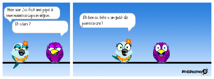 Case 1:Bird 1: Hier soir j'ai fait une pipe à mon nouveau copain végan.Bird 2: Et alors ? | Case 2: Bird 1: Eh ben sa bite a un goût de poireau cru ! | Case 3: