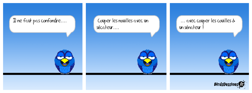 Case 1:Bird 1: Il ne faut pas confondre.... | Case 2: Bird 1: Couper les nouilles avec un sécateur.... | Case 3: Bird 1: ... avec couper les couilles à un sénateur !
