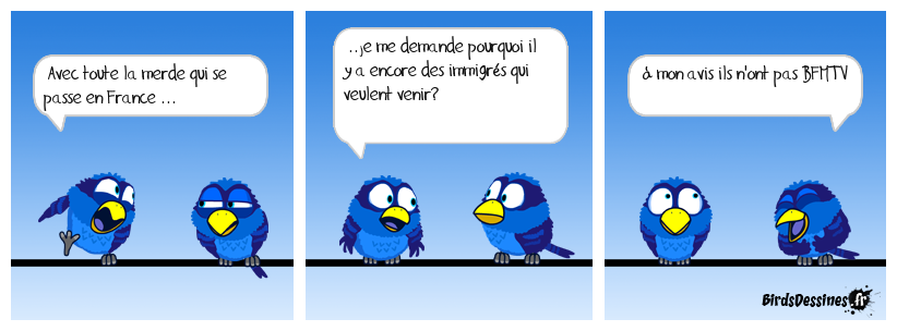 Case 1:Bird 1: Avec toute la merde qui se passe en France ... | Case 2: Bird 1: ..je me demande pourquoi il y a encore des immigrés qui veulent venir? | Case 3: Bird 1: à mon avis ils n'ont pas BFMTV