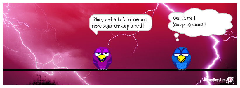 Case 1: | Case 2: Bird 1: Pluie, vent à la Saint Gérard, reste sagement au plumard ! | Case 3: Bird 1: Oui, j'aime ! Beau programme !