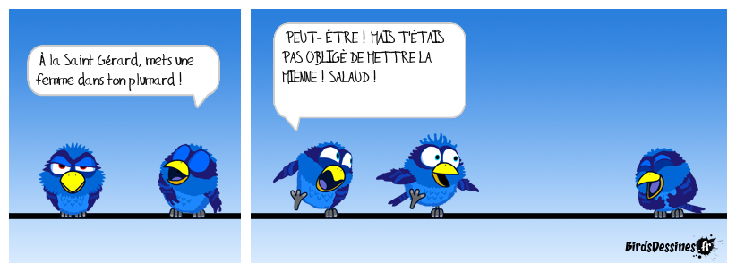 Case 1:Bird 1: À la Saint Gérard, mets une femme dans ton plumard ! | Case 2: Bird 1: PEUT- ÊTRE ! MAIS T'ÉTAIS PAS OBLIGÉ DE METTRE LA MIENNE ! SALAUD ! | Case 3: