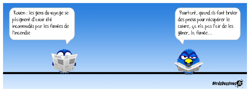 Case 1:Bird 1: Rouen : les gens du voyage se plaignent d'avoir été incommodés par les fumées de l'incendie | Case 2: | Case 3: Bird 1: Pourtant, quand ils font bruler des pneus pour récupérer le cuivre, ça n'a pas l'air de les gêner, la fumée...