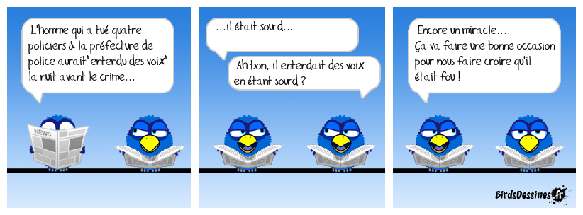 Case 1:Bird 1: L'homme qui a tué quatre policiers à la préfecture de police aurait"entendu des voix" la nuit avant le crime... | Case 2: Bird 1: ...il était sourd... Bird 2: Ah bon, il entendait des voix en étant sourd ? | Case 3: Bird 1: Encore un miracle.... Ça va faire une bonne occasion pour nous faire croire qu'il était fou !