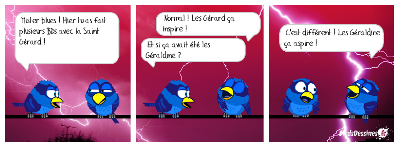 Case 1:Bird 1: Mister blues ! Hier tu as fait plusieurs BDs avec la Saint Gérard ! | Case 2: Bird 1: Normal ! Les Gérard ça inspire ! Bird 2: Et si ça avait été les Géraldine ? | Case 3: Bird 1: C'est différent ! Les Géraldine ça aspire !