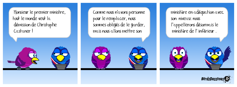 Case 1:Bird 1: Monsieur le premier ministre, tout le monde veut la démission de Christophe Castaner ! | Case 2: Bird 1: Comme nous n'avons personne pour le remplacer, nous sommes obligés de le garder, mais nous allons mettre son | Case 3: Bird 1: ministère en adéquation avec son niveau: nous l’appellerons désormais le ministère de l' inférieur .