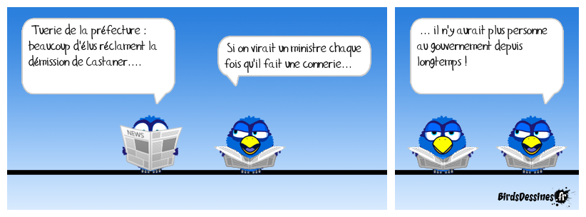 Case 1:Bird 1: Tuerie de la préfecture : beaucoup d'élus réclament la démission de Castaner.... | Case 2: Bird 1: Si on virait un ministre chaque fois qu'il fait une connerie... | Case 3: Bird 1: ... il n'y aurait plus personne au gouvernement depuis longtemps !