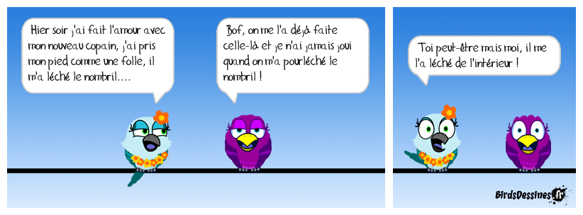 Case 1:Bird 1: Hier soir j'ai fait l'amour avec mon nouveau copain, j'ai pris mon pied comme une folle, il m'a léché le nombril.... | Case 2: Bird 1: Bof, on me l'a déjà faite celle-là et je n'ai jamais joui quand on m'a pourléché le nombril ! | Case 3: Bird 1: Toi peut-être mais moi, il me l'a léché de l'intérieur !