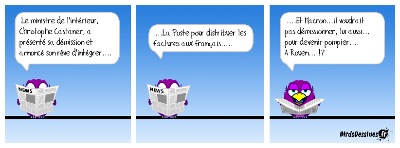 Case 1:Bird 1: Le ministre de l'intérieur, Christophe Castaner, a présenté sa démission et annoncé son rêve d'intégrer.... | Case 2: Bird 1: ...La Poste pour distribuer les factures aux français..... | Case 3: Bird 1: ....Et Macron...il voudrait pas démissionner, lui aussi... pour devenir pompier.... A Rouen....!?