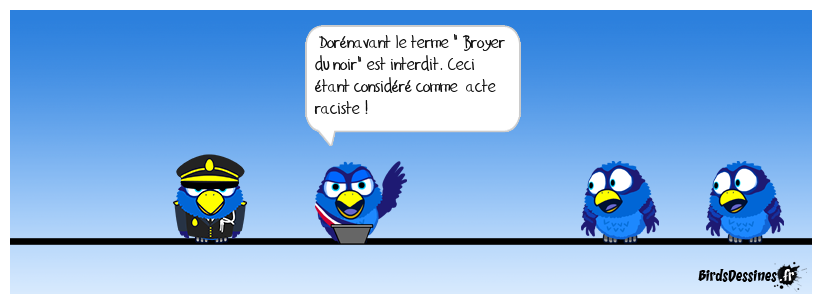 Case 1: | Case 2: Bird 1: Dorénavant le terme " Broyer du noir" est interdit. Ceci étant considéré comme acte raciste ! | Case 3: