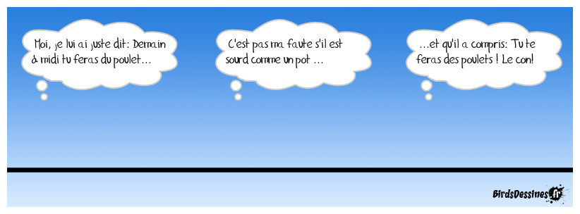 Case 1:Bird 1: Moi, je lui ai juste dit: Demain à midi tu feras du poulet... | Case 2: Bird 1: C'est pas ma faute s'il est sourd comme un pot ... | Case 3: Bird 1: ...et qu'il a compris: Tu te feras des poulets ! Le con!