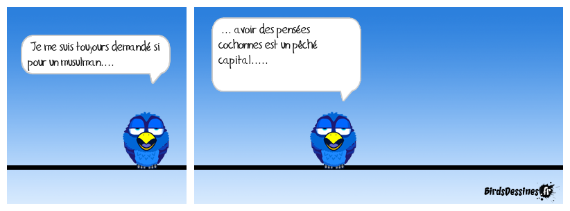 Case 1:Bird 1: Je me suis toujours demandé si pour un musulman.... | Case 2: Bird 1: ... avoir des pensées cochonnes est un pêché capital..... | Case 3: