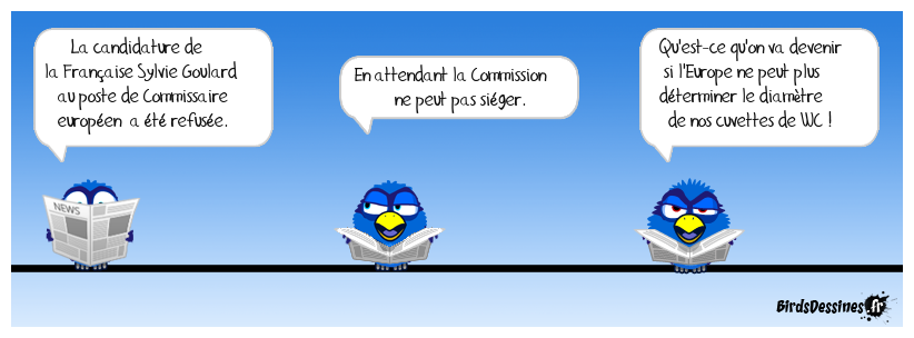 Case 1:Bird 1: La candidature de la Française Sylvie Goulard au poste de Commissaire européen a été refusée. | Case 2: Bird 1: En attendant la Commission ne peut pas siéger. | Case 3: Bird 1: Qu'est-ce qu'on va devenir si l'Europe ne peut plus déterminer le diamètre de nos cuvettes de WC !