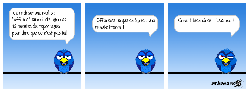 Case 1:Bird 1: Ce midi sur une radio : "Affaire" Dupont de ligonnès : 12 minutes de reportages pour dire que ce n'est pas lui! | Case 2: Bird 1: Offensive turque en Syrie : une minute trente ! | Case 3: Bird 1: On voit bien où est l'audimat!