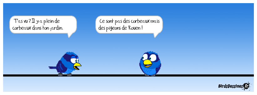 Case 1:Bird 1: T'as vu ? Il y a plein de corbeaux dans ton jardin. | Case 2: Bird 1: Ce sont pas des corbeaux mais des pigeons de Rouen ! | Case 3: