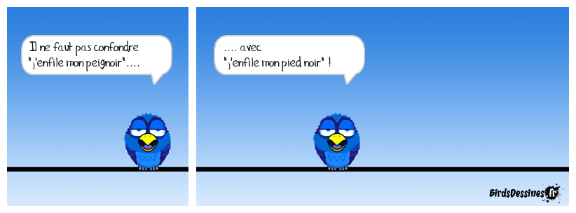 Case 1:Bird 1: Il ne faut pas confondre "j'enfile mon peignoir".... | Case 2: Bird 1: .... avec "j'enfile mon pied noir" ! | Case 3: