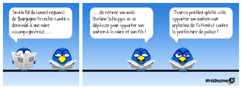 Case 1:Bird 1: Un élu RN du conseil régional de Bourgogne Franche-Comté a demandé à une mère accompagnatrice..... | Case 2: Bird 1: ... de retirer son voile. Marlène Schiappa va se déplacer pour apporter son soutien à la mère et son fils ! | Case 3: Bird 1: J'aurais préféré qu'elle aille apporter son soutien aux orphelins de l'attentat contre la préfecture de police !