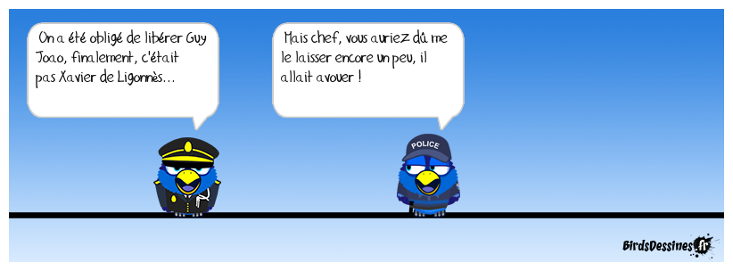 Case 1:Bird 1: On a été obligé de libérer Guy Joao, finalement, c'était pas Xavier de Ligonnès... | Case 2: Bird 1: Mais chef, vous auriez dû me le laisser encore un peu, il allait avouer ! | Case 3: