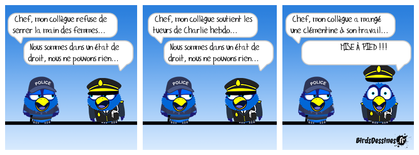 Case 1:Bird 1: Chef, mon collègue refuse de serrer la main des femmes...Bird 2: Nous sommes dans un état de droit, nous ne pouvons rien... | Case 2: Bird 1: Chef, mon collègue soutient les tueurs de Charlie hebdo... Bird 2: Nous sommes dans un état de droit, nous ne pouvons rien... | Case 3: Bird 1: Chef, mon collègue a mangé une clémentine à son travail... Bird 2: MISE À PIED !!!