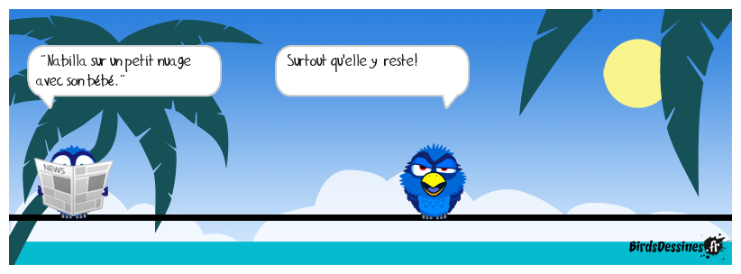 Case 1:Bird 1: ¨Nabilla sur un petit nuage avec son bébé.¨ | Case 2: Bird 1: Surtout qu'elle y reste! | Case 3: