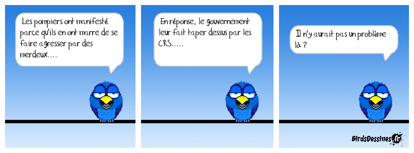 Case 1:Bird 1: Les pompiers ont manifesté parce qu'ils en ont marre de se faire agresser par des merdeux.... | Case 2: Bird 1: En réponse, le gouvernement leur fait taper dessus par les CRS..... | Case 3: Bird 1: Il n'y aurait pas un problème là ?