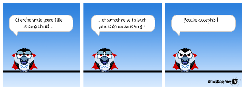 Case 1:Bird 1: Cherche vraie jeune fille au sang chaud... | Case 2: Bird 1: ...et surtout ne se faisant jamais de mauvais sang ! | Case 3: Bird 1: Boudins acceptés !