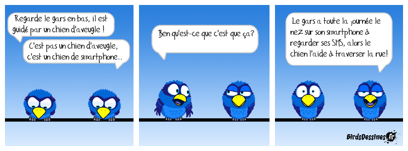 Case 1:Bird 1: Regarde le gars en bas, il est guidé par un chien d'aveugle !Bird 2: C'est pas un chien d'aveugle, c'est un chien de smartphone.. | Case 2: Bird 1: Ben qu'est-ce que c'est que ça? | Case 3: Bird 1: Le gars a toute la journée le nez sur son smartphone à regarder ses SMS, alors le chien l'aide à traverser la rue!