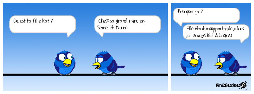 Case 1:Bird 1: Où est ta fille Kat ? | Case 2: Bird 1: Chez sa grand-mère en Seine-et-Marne.. | Case 3: Bird 1: Pourquoi ça ? Bird 2: Elle était insupportable,alors j'ai envoyé Kat à Lognes