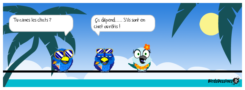 Case 1:Bird 1: Tu aimes les chats ? | Case 2: Bird 1: Ça dépend..... S'ils sont en civet ou rôtis ! | Case 3: