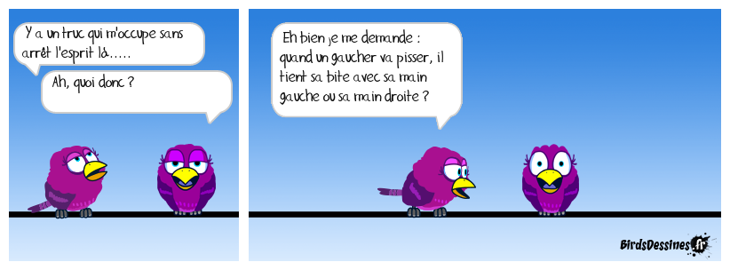 Case 1:Bird 1: Y a un truc qui m'occupe sans arrêt l'esprit là.....Bird 2: Ah, quoi donc ? | Case 2: Bird 1: Eh bien je me demande : quand un gaucher va pisser, il tient sa bite avec sa main gauche ou sa main droite ? | Case 3: