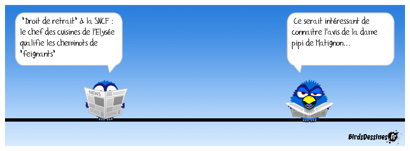 Case 1:Bird 1: "Droit de retrait" à la SNCF : le chef des cuisines de l'Elysée qualifie les cheminots de "feignants" | Case 2: | Case 3: Bird 1: Ce serait intéressant de connaitre l'avis de la dame pipi de Matignon...