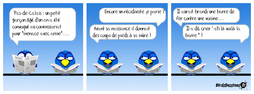 Case 1:Bird 1: Pas-de-Calais : un petit garçon âgé d'un an a été convoqué au commissariat pour "menace avec arme".... | Case 2: Bird 1: Encore un récidiviste je parie ? Bird 2: Avant sa naissance il donnait des coups de pieds à sa mère ! | Case 3: Bird 1: Il aurait brandi une barre de fer contre une voisine.... Bird 2: Il a dû crier ' ah là voilà la barre " !