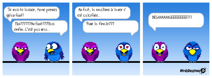Case 1:Bird 1: Je vais te laisser, tu ne penses qu'au foot!Bird 2: Moi??????Au foot???Mais enfin..C'est pas vrai.. | Case 2: Bird 1: Au fait, la machine à laver s' est calcifiée.. Bird 2: Pour la finale??? | Case 3: Bird 1: DÉGAAAAAAGEEEEEEEEE!!!