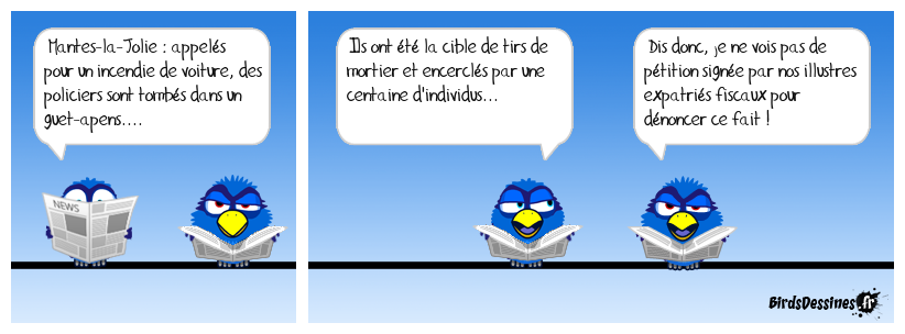 Case 1:Bird 1: Mantes-la-Jolie : appelés pour un incendie de voiture, des policiers sont tombés dans un guet-apens.... | Case 2: Bird 1: Ils ont été la cible de tirs de mortier et encerclés par une centaine d'individus... | Case 3: Bird 1: Dis donc, je ne vois pas de pétition signée par nos illustres expatriés fiscaux pour dénoncer ce fait !