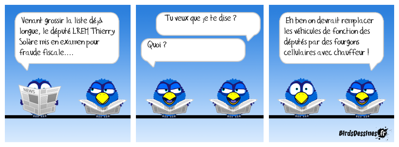 Case 1:Bird 1: Venant grossir la liste déjà longue, le député LREM Thierry Solère mis en examen pour fraude fiscale.... | Case 2: Bird 1: Tu veux que je te dise ? Bird 2: Quoi ? | Case 3: Bird 1: Eh ben on devrait remplacer les véhicules de fonction des députés par des fourgons cellulaires avec chauffeur !