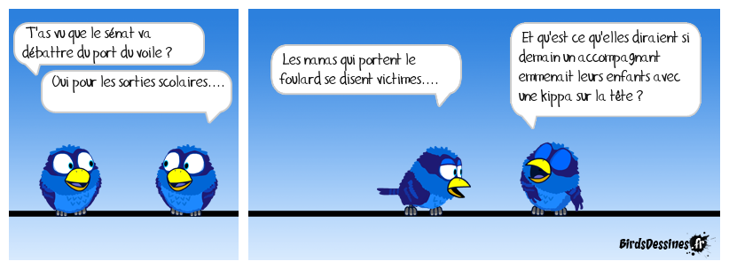 Case 1:Bird 1: T'as vu que le sénat va débattre du port du voile ?Bird 2: Oui pour les sorties scolaires.... | Case 2: Bird 1: Les nanas qui portent le foulard se disent victimes.... | Case 3: Bird 1: Et qu'est ce qu'elles diraient si demain un accompagnant emmenait leurs enfants avec une kippa sur la tête ?