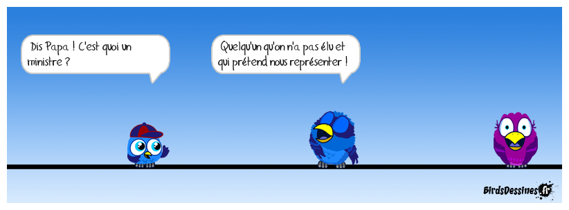 Case 1:Bird 1: Dis Papa ! C'est quoi un ministre ? | Case 2: Bird 1: Quelqu'un qu'on n'a pas élu et qui prétend nous représenter ! | Case 3: