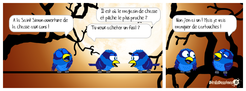Case 1:Bird 1: A la Saint Simon ouverture de la chasse aux cons ! | Case 2: Bird 1: Il est où le magasin de chasse et pêche le plus proche ? Bird 2: Tu veux acheter un fusil ? | Case 3: Bird 1: Non j'en ai un ! Mais je vais manquer de cartouches !
