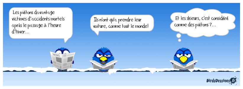 Case 1:Bird 1: Les piétons davantage victimes d’accidents mortels après le passage à l’heure d’hiver... | Case 2: Bird 1: Ils n'ont qu'a prendre leur voiture, comme tout le monde! | Case 3: Bird 1: Et les skieurs, c'est considéré comme des piétons ?...