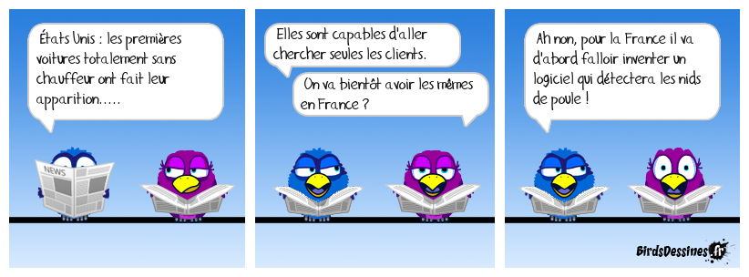 Case 1:Bird 1: Ètats Unis : les premières voitures totalement sans chauffeur ont fait leur apparition..... | Case 2: Bird 1: Elles sont capables d'aller chercher seules les clients. Bird 2: On va bientôt avoir les mêmes en France ? | Case 3: Bird 1: Ah non, pour la France il va d'abord falloir inventer un logiciel qui détectera les nids de poule !
