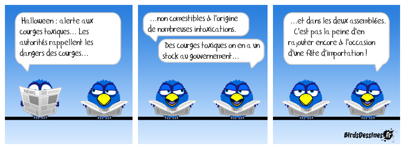 Case 1:Bird 1: Halloween : alerte aux courges toxiques... Les autorités rappellent les dangers des courges... | Case 2: Bird 1: ...non comestibles à l'origine de nombreuses intoxications. Bird 2: Des courges toxiques on en a un stock au gouvernement... | Case 3: Bird 1: ...et dans les deux assemblées. C'est pas la peine d'en rajouter encore à l'occasion d'une fête d'importation !