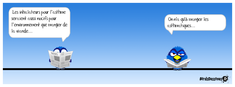 Case 1:Bird 1: Les inhalateurs pour l’asthme seraient aussi nocifs pour l’environnement que manger de la viande... | Case 2: | Case 3: Bird 1: On n'a qu'à manger les asthmatiques...
