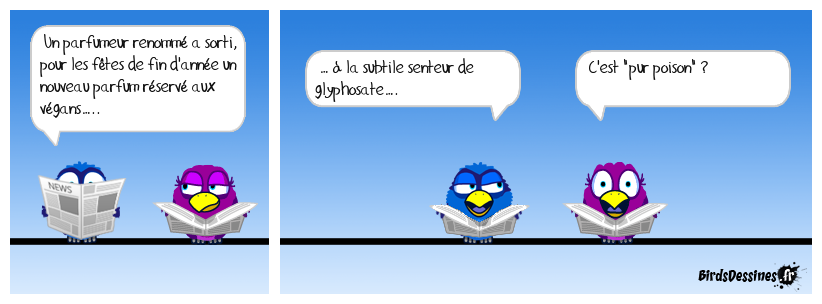 Case 1:Bird 1: Un parfumeur renommé a sorti, pour les fêtes de fin d'année un nouveau parfum réservé aux végans….. | Case 2: Bird 1: … à la subtile senteur de glyphosate…. | Case 3: Bird 1: C'est "pur poison" ?