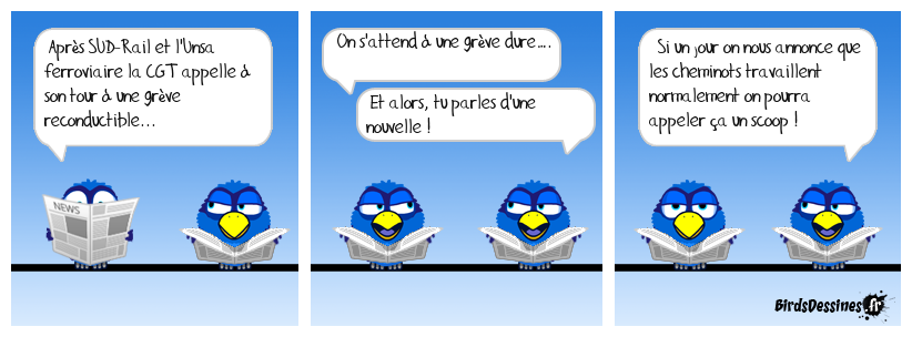 Case 1:Bird 1: Après SUD-Rail et l'Unsa ferroviaire la CGT appelle à son tour à une grève reconductible... | Case 2: Bird 1: On s'attend à une grève dure…. Bird 2: Et alors, tu parles d'une nouvelle ! | Case 3: Bird 1: Si un jour on nous annonce que les cheminots travaillent normalement on pourra appeler ça un scoop !