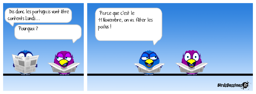 Case 1:Bird 1: Dis donc les portugais vont être contents Lundi...Bird 2: Pourquoi ? | Case 2: Bird 1: Parce que c'est le 11 Novembre, on va fêter les poilus ! | Case 3: