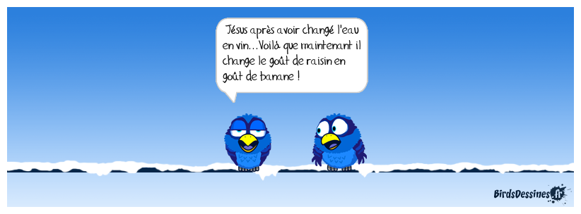 Case 1: | Case 2: Bird 1: Jésus après avoir changé l'eau en vin...Voilà que maintenant il change le goût de raisin en goût de banane ! | Case 3: