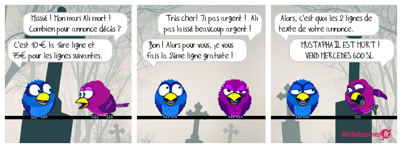 Case 1:Bird 1: Missié ! Mon mari Ali mort ! Combien pour annonce décès ?Bird 2: C'est 10 € la 1ère ligne et 75€ pour les lignes suivantes. | Case 2: Bird 1: Très cher! Ji pas argent ! Ali pas laissé beaucoup argent ! Bird 2: Bon ! Alors pour vous, je vous fais la 2ème ligne gratuite ! | Case 3: Bird 1: Alors, c'est quoi les 2 lignes de texte de votre annonce. Bird 2: MUSTAPHA IL EST MORT ! VEND MERCEDES 600 SL