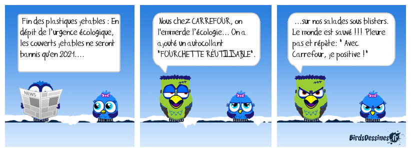 Case 1:Bird 1: Fin des plastiques jetables : En dépit de l’urgence écologique, les couverts jetables ne seront bannis qu'en 2021.... | Case 2: Bird 1: Nous chez CARREFOUR, on l'emmerde l’écologie... On a ajouté un autocollant "FOURCHETTE RÉUTILISABLE". | Case 3: Bird 1: ...sur nos salades sous blisters. Le monde est sauvé !!! Pleure pas et répète: " Avec Carrefour, je positive !"