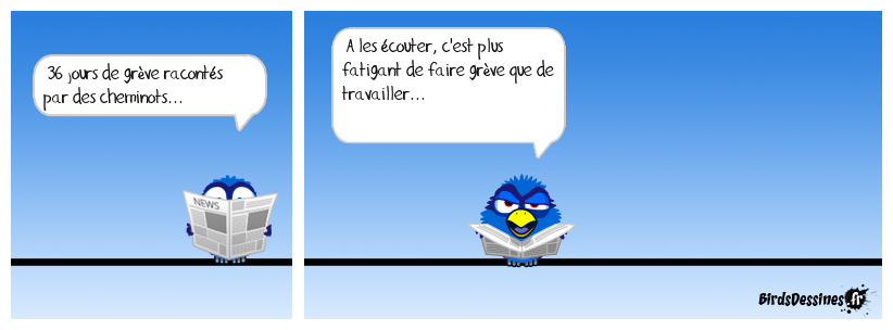Case 1:Bird 1: 36 jours de grève racontés par des cheminots... | Case 2: Bird 1: A les écouter, c'est plus fatigant de faire grève que de travailler... | Case 3: