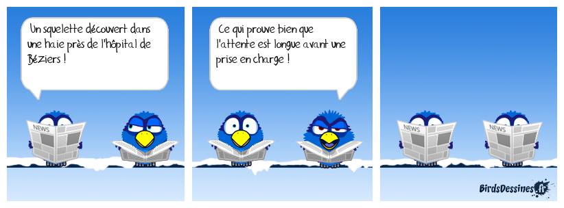 Case 1:Bird 1: Un squelette découvert dans une haie près de l'hôpital de Béziers ! | Case 2: Bird 1: Ce qui prouve bien que l'attente est longue avant une prise en charge ! | Case 3: